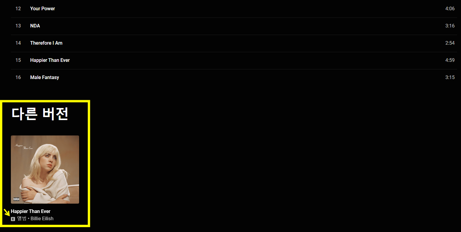 Billie Eilish의 Happier Than Ever 앨범을 보고 있는데 스크롤해서 내려보니 다른 버전이 있더라고요.